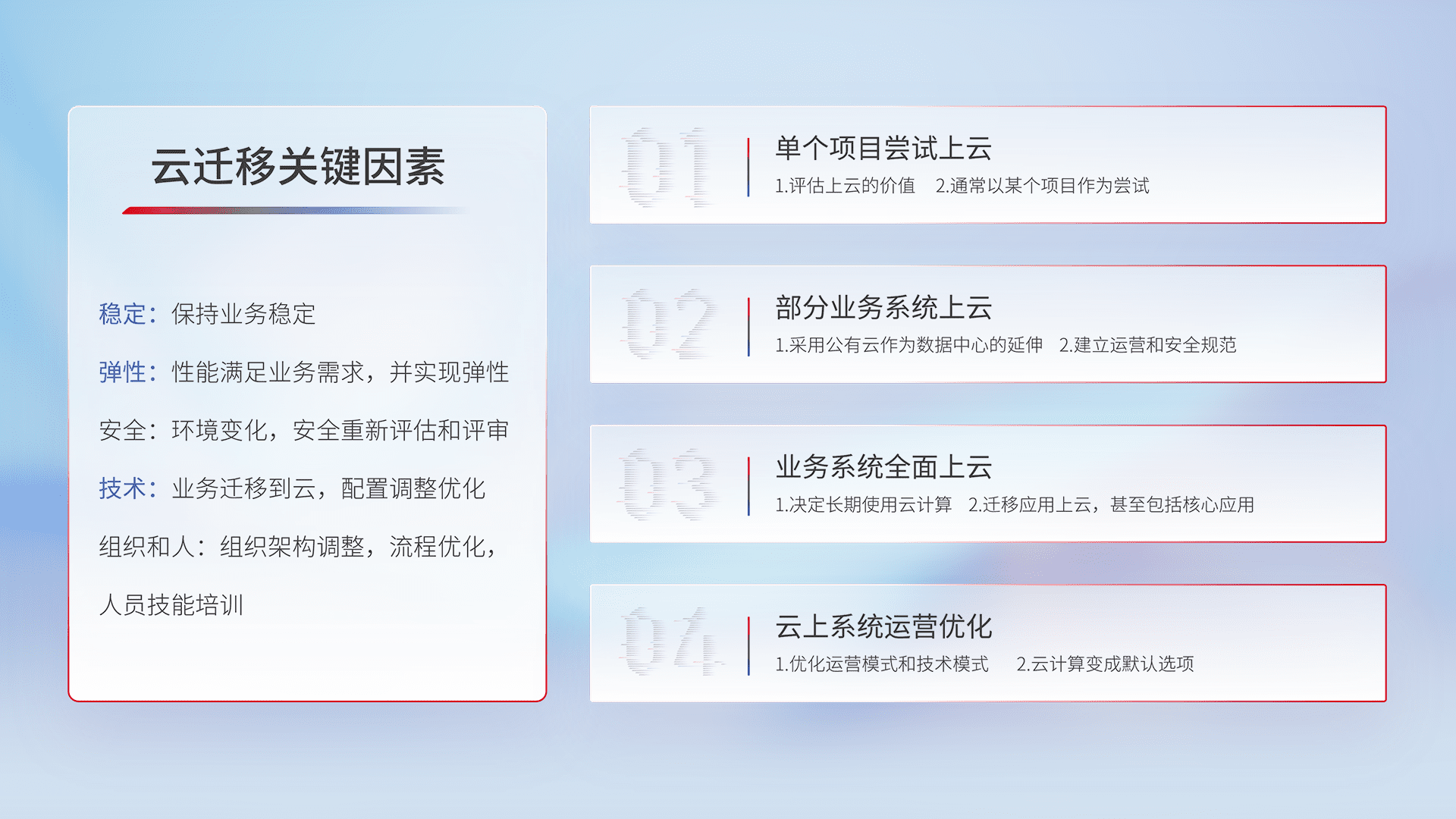 结合实际业务,,,从规划设计、、、云平台选型、、、云原生改造、、、、数据迁移、、集成交付,,迁移全过程为客户识别最佳上云路径,,,做好风险识别管理,,设计网络架构、、身份权限、、安全审计合规、、操作审计、、、、日志审计、、、、监控告警策略、、、、多站点容灾设计等,,,对云上基础设施进行整体规划,,,提升IT治理水平,,,,以满足弹性、、高可用、、高性能的需求。。。。