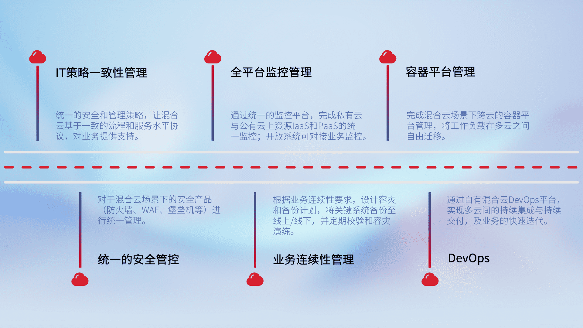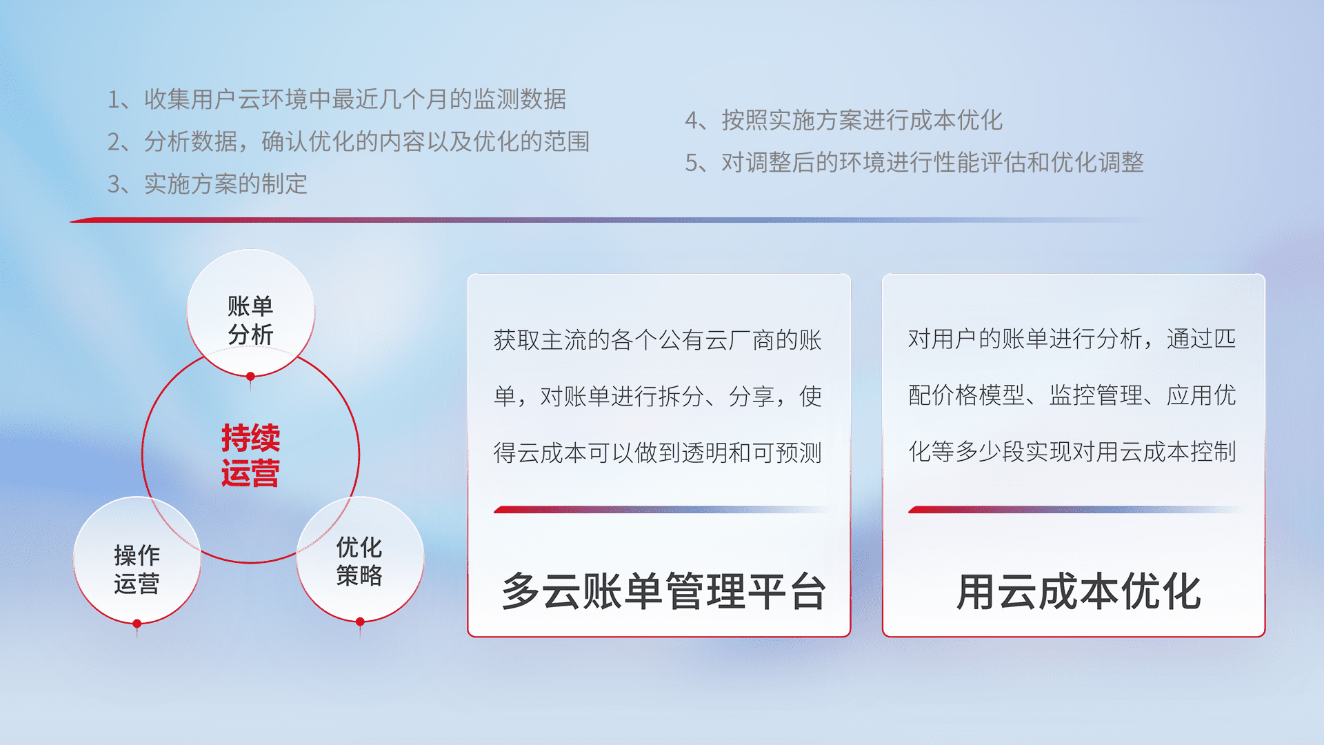 通过多云纳管,,,,以统一的资源数据模型把客户的云资源进行抽象和封装,,,进而实现对多云资源的统一操作,,,保障云资源管理的可靠性、、、、稳定性与可用性。。。量身定制化运维内容,,,配置、、、开发运维、、、补丁管理、、、备份、、、、监控、、、、认证和访问管理、、审计和日常巡检等,,,保障在用云过程中的可靠度,,,,稳定度以及高可用率。。